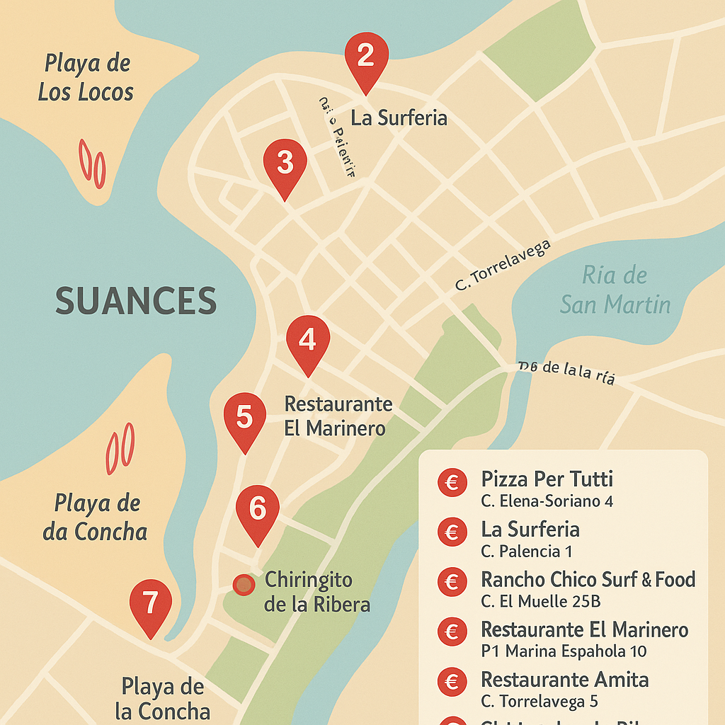 Antes de entrar en detalles, te dejamos un mapa interactivo con los 7 restaurantes seleccionados. Así podrás ver de un vistazo dónde están ubicados, si te pillan cerca de la playa, del centro o de tu alojamiento. Ideal para decidir sobre la marcha mientras paseas por Suances.